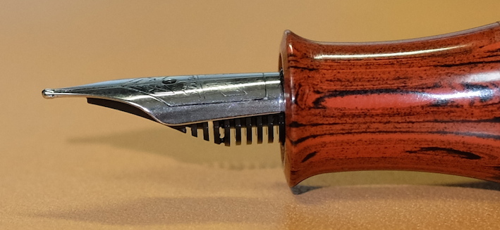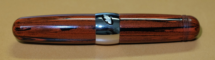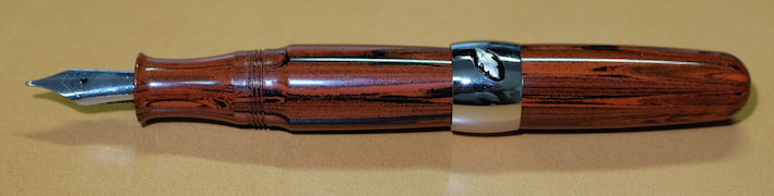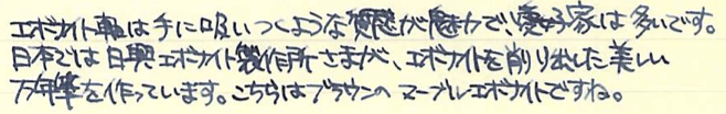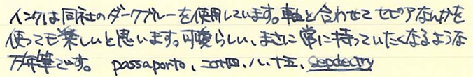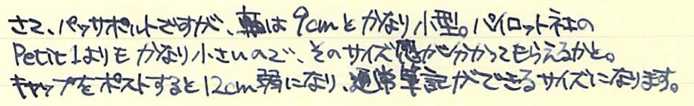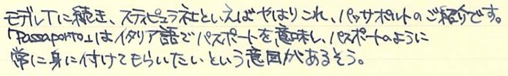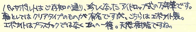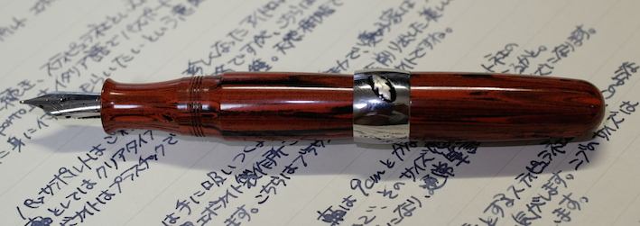 レビュー:Stipula パッサポルト エボナイト Category:筆記具 Date:2014年08月15日 お盆ですね。この時期は毎年水の事故が多いので、皆様も御気をつけください。実はちょっと前に手に入れていたパッサポルト。フローの改善をしていましたら時間がかかってしまいました。なんとか普通に筆記が出来る状態になりましたので記事にします。 スティピュラ社の万年筆で一番目につきやすいのがこちらのパッサポルトではないでしょうか。特にクリア・レジンのものが有名で、透明軸のなかでインクがたゆたう姿に恍惚を感じた方も多いでしょう。 スティピュラ社はアイドロップ式の万年筆やインクローラーを多数出していますのでインクの気密性を高めるノウハウがあるのでしょう。普通の万年筆でこれをやろうとするとインク漏れやらなんやらで大変だそうです。インクは軸のなかに、こちらのスポイトを使って直接注入します。ミニサイズの軸にもかかわらず、思ったよりインクが入ります。 エボナイトは黒檀(Ebony)が名前の由来になっていますので、黒色のイメージが強いですね。このパッサポルトはブラウンとブラックのマーブルになっており、木目のような美しい模様を形成しています。手馴染みもよく、エボナイトの魅力をしっかり味わえます。 クリップの無いころんとした形状のパッサポルト。キャップと尾軸にはネジが切ってあり、ここにポストし、手で包み込むようにして筆記すると心地よい筆記感が得られます。 独特のしなりがある反面、コントロールが難しいチタンニブはモデルTのような大型の軸の方が合っています。パッサポルトのようなミニサイズ万年筆だと、しなりは無い反面、コントロールがし易いステンレスニブの方が合っていると思います。パッサポルトと言えばクリア軸!ですが、比較的御手頃な価格でエボナイト軸の独特の艶かしさを味わえる万年筆に仕上がっています。 PR