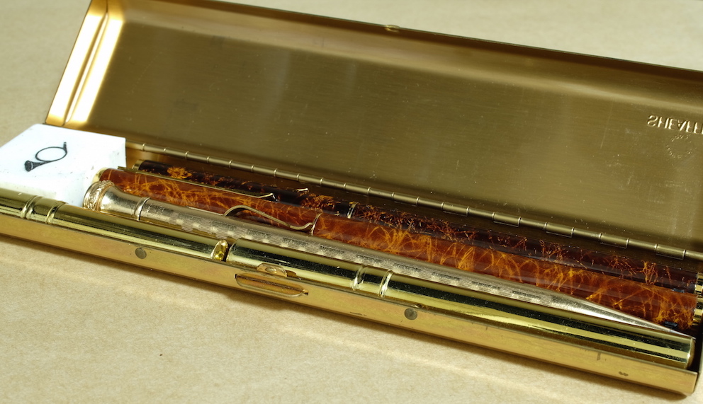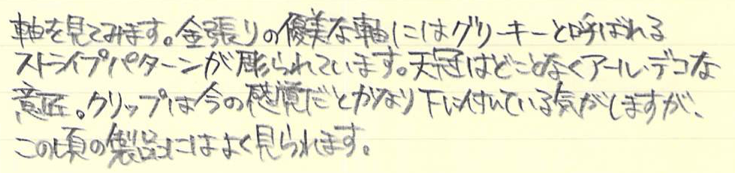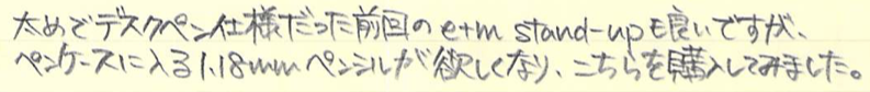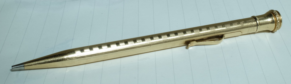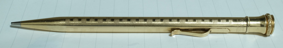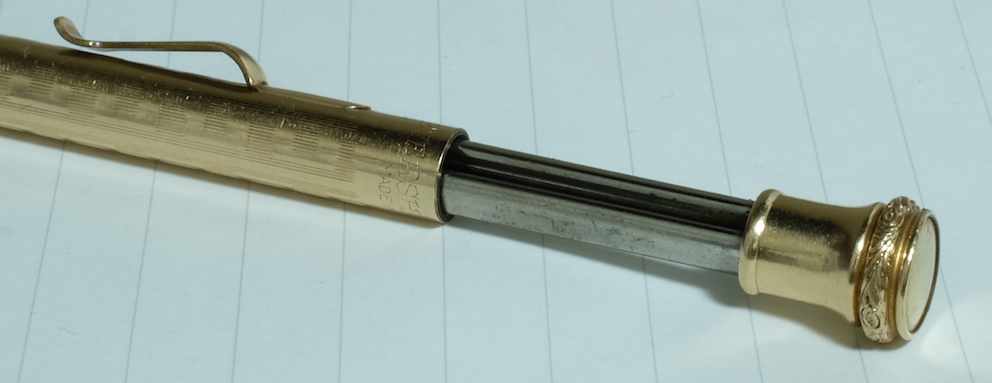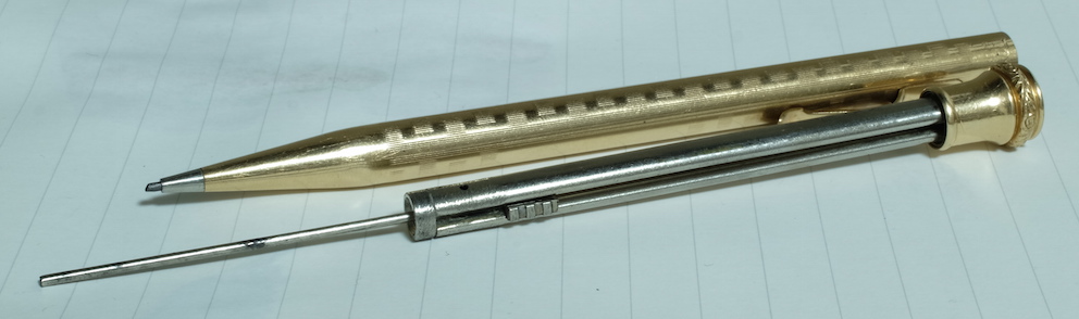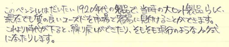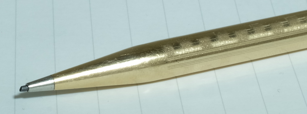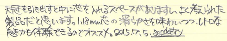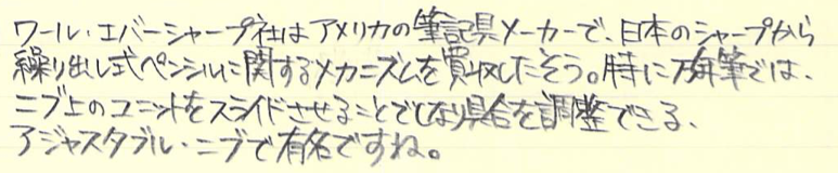 レビュー:WAHL EVERSHARP 1.18mmペンシル Category:筆記具 Date:2015年07月05日 めくるめく1.18mmペンシルの世界・・・ということで、ワールエバーシャープ社の金貼りペンシルになります。歴史を感じますねー。エバーシャープという社名は、「常にとんがった鉛筆」を意味するらしく、繰り出し式ペンシルの黎明期を感じる名前ですよね。 わたしは細身のブラスペンケースを使っているのですが、ずっとペンシル枠が未定の状態なのでその場に収まるペンシルを探していたのです、そこで今回こちらを入手してみました。 アジャスタブル・ニブは現在のジャスタスの前進のようなニブで、ニブ上のユニットをめもりに合わせて手動で動かすことでしなりを調整するという面白い機構。 ヴィンテージペンシルは回転繰り出しにしてもいろいろな機構があって、さらにはマルチペンシルなんて色物もあったりして非常に面白い世界ですよね。 内部機構を見ると本当にシンプルで、天冠を回転させることで棒が芯を押し出すというもの。シンプルゆえに故障も少ないのか、しっかりと動作するユーズドがおおいのもこのころの製品の特徴かと思います。 このペンシルは機構上、そう長い芯を使うことはできませんので、短めの芯を何個か用意しておくのが大切かと思います。芯が折れることはまずないので、思ったよりは長持ちします。わたしは真鍮製の芯ケースを購入したので、こちらもいずれ記事にしようと思っています。 PR