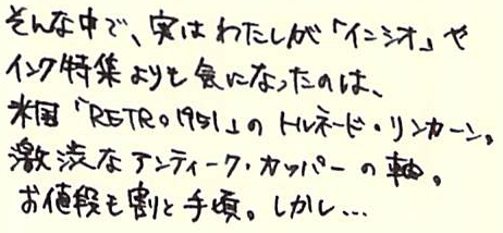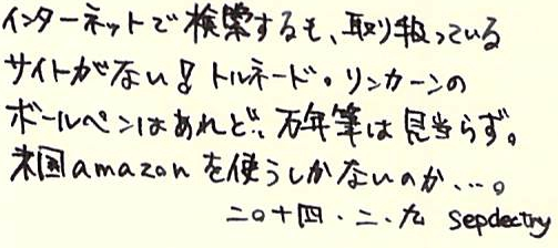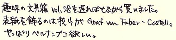趣味の文具箱とRETRO1951 Category:筆記具 Date:2014年02月09日 レビューじゃないのでこのカテゴリにしようか迷いましたが、結局ここで。 趣味の文具箱、買いました。こんばんわ、sepdectryです。 あ、ラミー2000は結局、竹炭を買って吸わせてしまいました。 霧雨よりキリッとした黒!気に入ってます。 いやー物欲を刺激する表紙ですよね。パーフェクトペンシルは専門外ですが 買ってしまいそうになりますね。かっこいいし。 記事はインク特集や新製品紹介など。特にファーバーカステルは 特集を組まれており、先日私がレビューしましたボトルインクも載っていました。 また、伯爵コレクションの新商品、エントリークラスとなる「イニシオ」も紹介。 リブ・パターンとあのキャップはたまりません!しかし、気になったのはニブ。 あの値段で金ペンじゃないのか・・・と。別に金ペンにあらずんば万年筆にあらず! みたいな金ペン党じゃないつもりなのですが、どうしても値段を見てしまいますね。 RETRO1951社から画像をお借りしました。 うーん!渋い!どことなくスチーム・パンクの香りがしますね。 キャップ先端のローレットがたまりません。 ボールペンはこのローレットを回転させてペン先を繰り出すらしいのですが。 万年筆の場合はただの飾りかな?かっこいいからいいですけど。 amazonを使えば買える・・・はず。 東京とかに行けばかえるのかもしれないですが。田舎のつらいところです。 PR