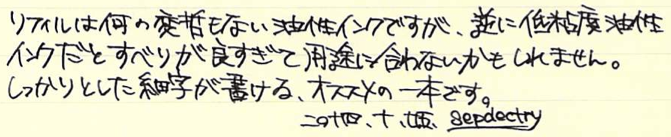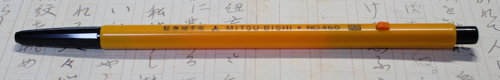 レビュー:三菱鉛筆 証券細字用 Category:筆記具 Date:2014年10月26日 オレンジ色の細身文具が続きますが、今回は国産です。三菱鉛筆の証券細字用ボールペンはおよそ40年の歴史がある製品で、公文書や証券を安定して筆記出来るという謳い文句を持っています。 オレンジと黒の配色といい、ノックを戻すときのボタンの感じなど、なんともレトロ・・・。 ちょうど、この証券細字用ボールペンが発売されたときは、Bicオレンジが活躍していたのか、軸の細さから配色から、何から何までそっくりです。このペン先の黒い部分は十二角錐のようになっていたりと、そこはかとないコダワリも感じられます。 この、小さいボタンでノックを解除する方式って昔はけっこう見た気がしますが・・・。最近はあまり見かけませんね。レトロさを感じる意匠であります。 この書きやすさ、証券用という用途以外にも愛用者は多く、何本も買いだめしている人もいるくらいです。以前は赤と青もあったようですが、現在は廃盤になっています。 オレンジ色細字系を三本並べて。特に証券細字用とBicオレンジは本当にそっくりです。樹脂の色までそっくり。ですが、使い心地は全然違う二本なので、是非書き比べてください。 PR