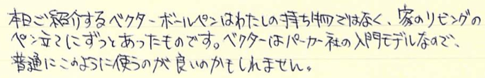 レビュー:PARKER Vector ボールペン フライター Category:筆記具 Date:2014年04月27日 パーカー社の製品は矢羽根クリップのおかげか、セットで持つと一体感があって満足度が高いですよね。 このベクターは既に廃盤になっている製品ですが、インターネット通販などでまだ手に入るお店があるようです。 まさに、普段使いのパーカーといった使われ方をしてるこのベクターです。 先日ご紹介したパーカー50万年筆、フライターと並べて。同じシリーズのものではないのですが、フライター仕上げと言うことでセット感がありますね。 ペルナンブコはゴリアットリフィルを無理矢理使うことができたのですが、こちらのベクターはペン先がずっと出た状態になってしまい、使えませんでした。 ベクター万年筆でいう、キャップの部分がすべてノックの可動部分になっています。見た感じは、キャップ式のボールペンのキャップをポストしたような。 ジョッターのフライターは母親がペンケースに入れて使っているようです。我が家にはパーカー製品が結構あるみたいですね。 PR